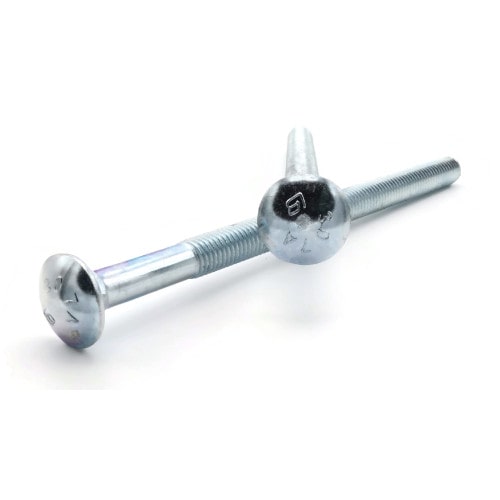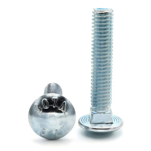 1/4"-20 Zinc plated steel carriage bolts have a domed or countersunk head, and the shank is topped by a short square section under the head.