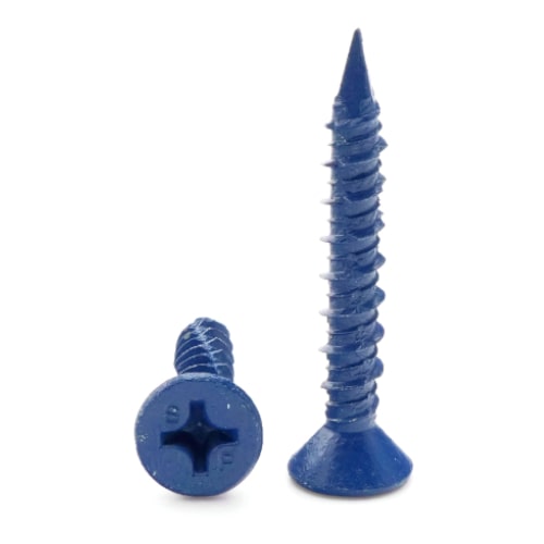A Phillips Flat Head Concrete Screw, also known as a masonry screw, features a blue climaseal coating and are ideal for applications involving concrete, brick, or block.