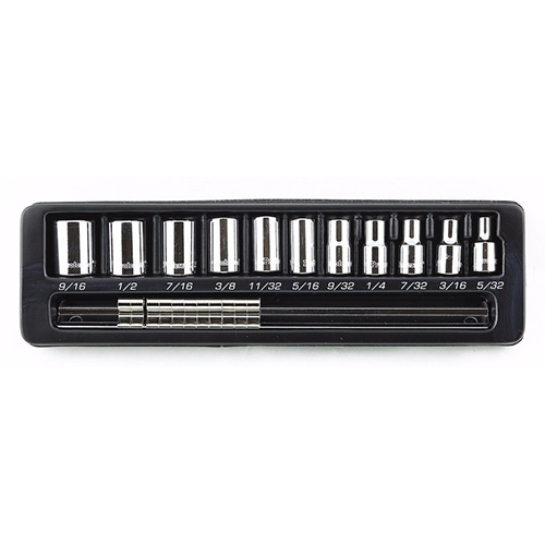 11 Piece 1/4" Drive SAE 6 Point Socket Set featuring a stress reduced hex drive. This set includes a variety of standard sizes with a 1/4" drive.