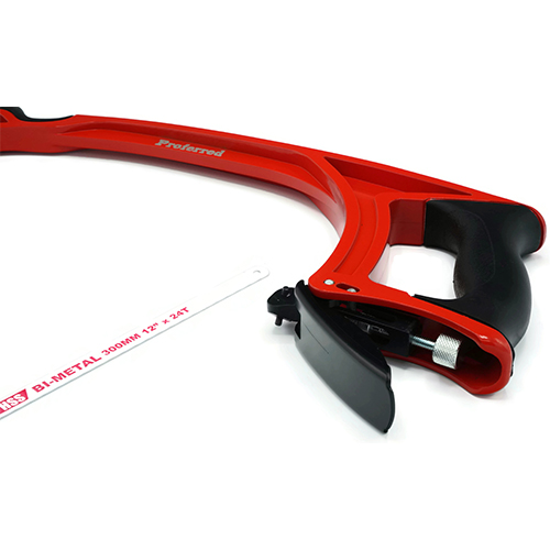 12" Hacksaw frame designed for use with our 12" x 24T hack saw blades featuring a fully adjustable tension mechanism that cuts at 45 and 90 degree angles. This professional quality saw frame features a single thumb-dial adjustable tension mechanism for easy adjustment with a professional quick-release lever allow for fast blade change.
