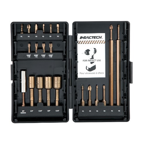 The 21 Piece Impactech Driver Bit Set is a professional quality set of impact driver bits made from S2 modified shock resistant steel. Each bit has a patented spiral shank to absorb impact and extend the bit life making them a durable solution for all work environments. These bits have CNC machined tips for an excellent fit in the fastener recess. Not only are these bits of durable quality, but they have also been tested to outperform other leading brands of the same category.