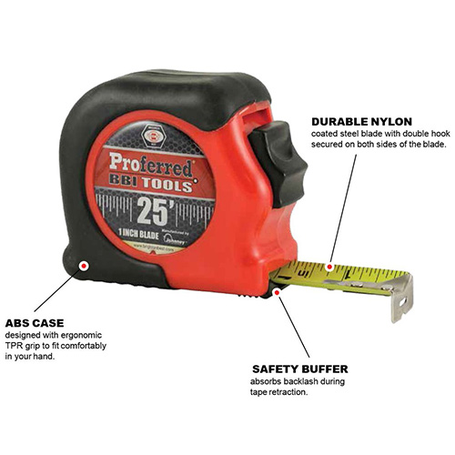 Measure twice and cut once with this 25-foot General Purpose economy tape measure featuring an ABS case with TPR for a comfortable no-slip grip. Tape Measures in this selection feature a durable, nylon coated steel 1-inch blade with double hook secured on both sides of the blade, and a safety buffer to absorb backlash during the tape retraction.