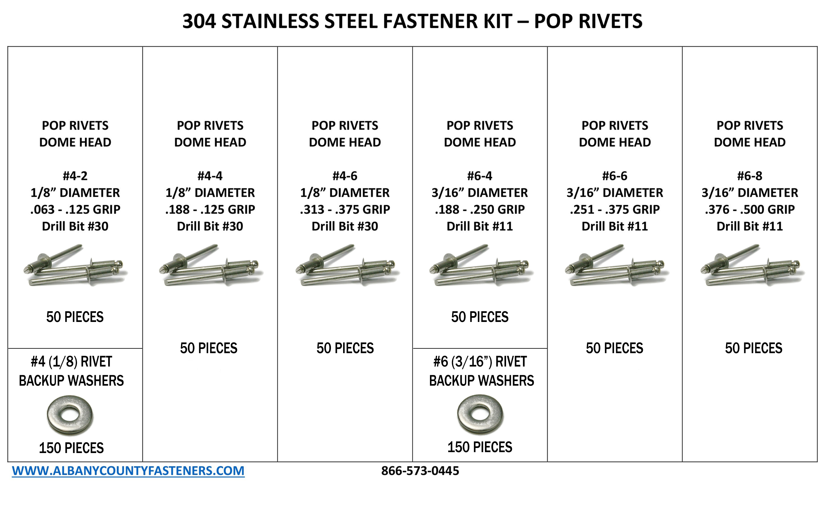 304 Stainless Steel Rivet Size Run - #4-2 through #6-8 with 1/8" and 3/16" Rivet Washers