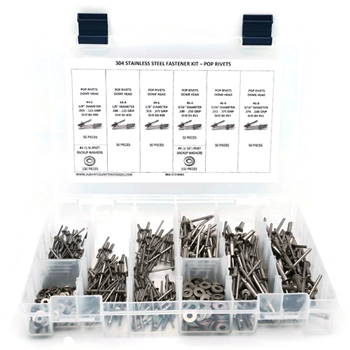 Kit Assortment, Pop Rivets with Washers, Stainless Steel 304, Sizes #4-2 through #6-8, 601 Pieces