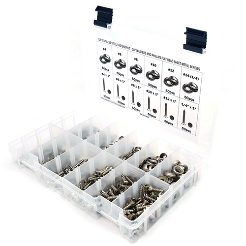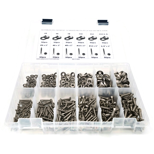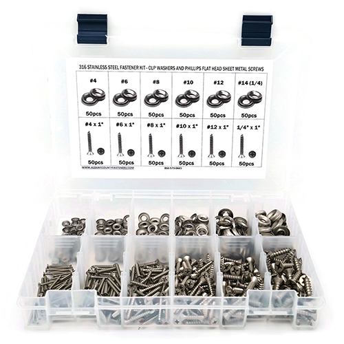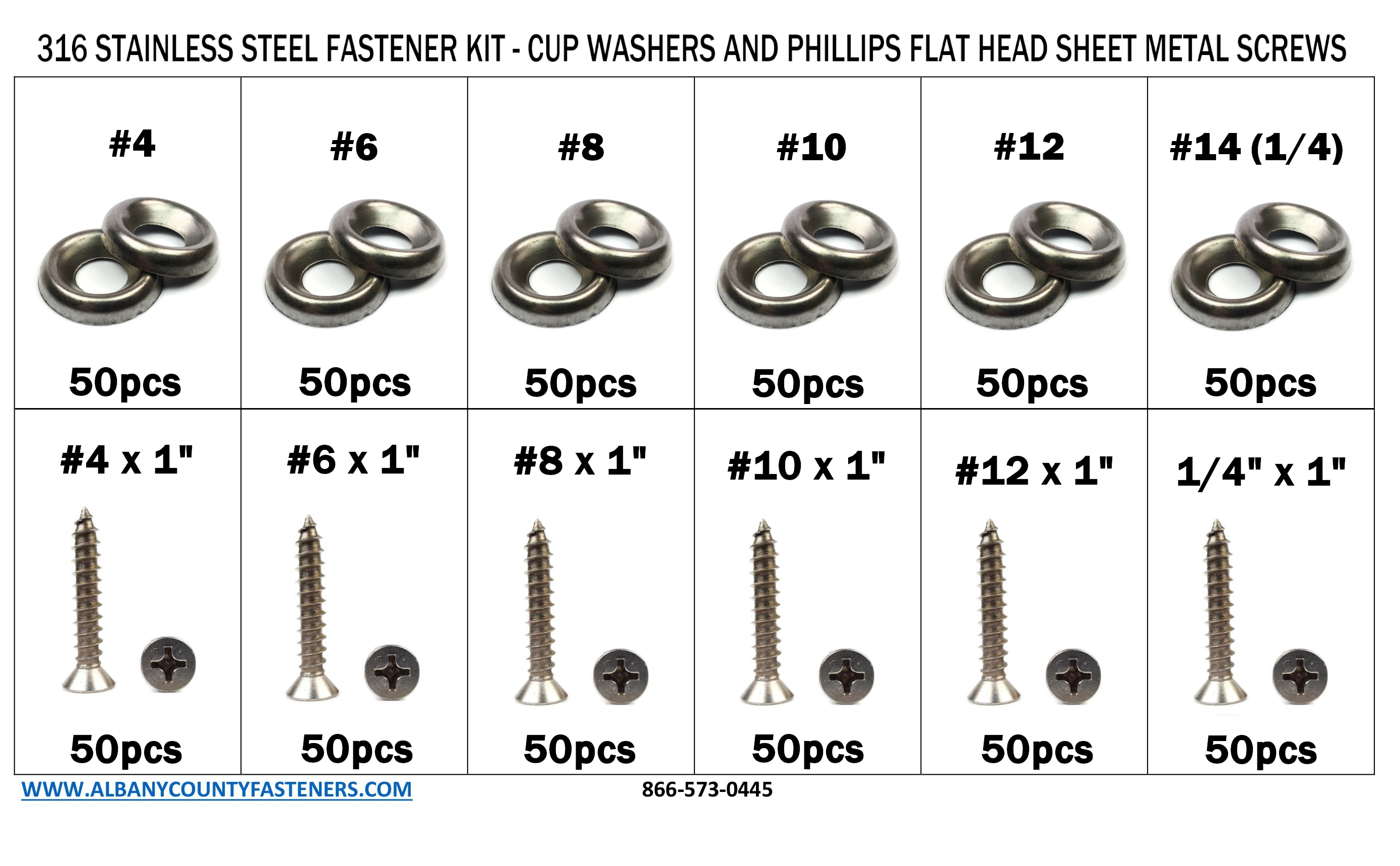 Kit, Sheet Metal Screws w/ Finishing Cup Washers, Phillips Flat Head, Stainless Steel 316, 601 Piece