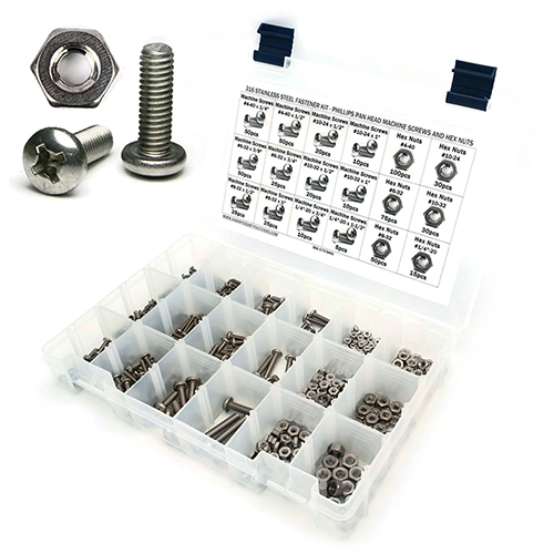 The 316 Stainless Steel Phillips Pan Head Machine Screw kit with Hex Nuts features a size assortment of screws and nuts in thread sizes #4-40 through 1/4"-20 all organized in a labeled compartment box for easy identification. The term machine screw is a commonly used to describe screws of smaller sizes.