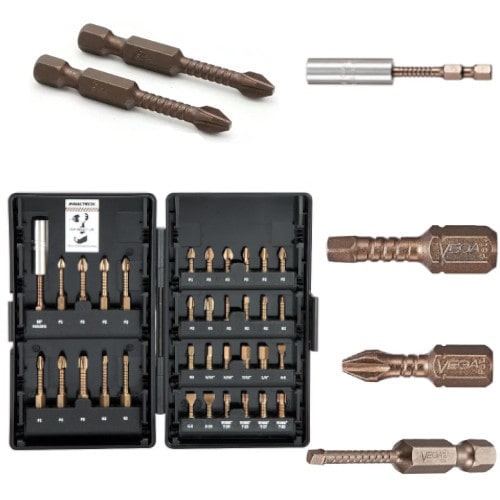 The 34 Piece Impactech Driver Bit Set is a professional quality set of impact driver bits made from S2 modified shock resistant steel. Each bit has a patented spiral shank to absorb impact and extend the bit life making them a durable solution for all work environments. These bits have CNC machined tips for an excellent fit in the fastener recess. Not only are these bits of durable quality, but they have also been tested to outperform other leading brands of the same category.