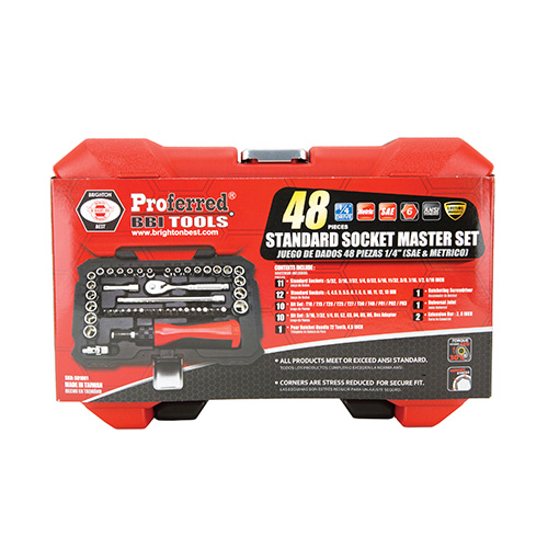 48 Piece 1/4" Drive SAE & Metric 6 Point Master Socket Set featuring a stress reduced hex drive. This set includes a variety of standard sizes with a 1/4" drive. This is a product that is built to last. Packaged in a durable carrying case.