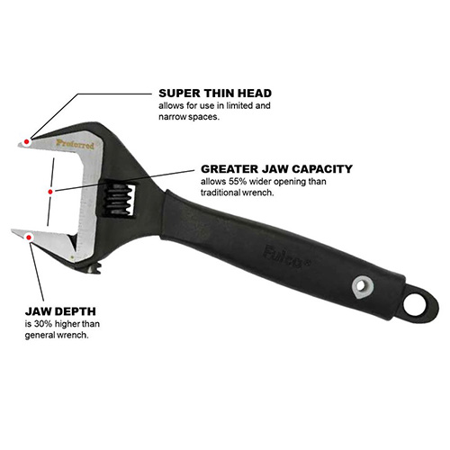 The Adjustable Plumbing Wrench is a must have tool for any plumber. Designed with the plumber in mind, the adjustable plumbers wrench has a super thin head which allows for use in limited and narrow spaces.