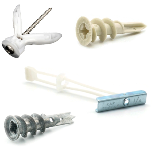 - Drywall and plaster: toggle bolts, hollow-wall anchors, self-drilling drywall anchors