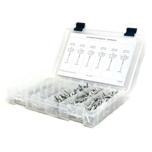 Aluminum open end blind pop rivets in a range that are organized in a durable plastic assortment kit.