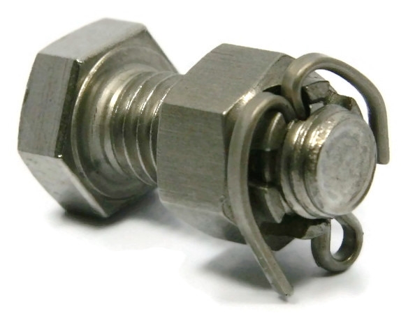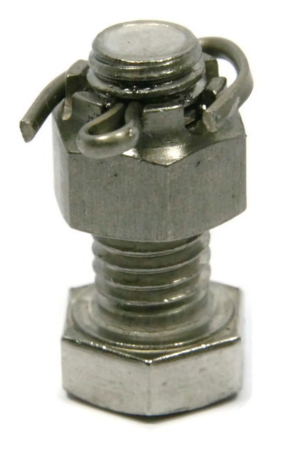 A Castle nut, castellated nut, or slotted nut is normally used with a Cotter Pin to create a locking fastener assembly that cannot be loosened due to accidental vibration. It is common to see this type of nut on vehicles and machinery where vibration is frequent.