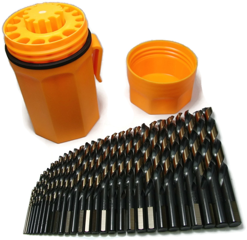 Super Premium 29 Piece Magnum Drill Bit Set is built for exceptional drilling performance. Packaged in a convenient, patented high visibility orange ultradex is easy to see and find. Easy to carry around with durable, long lasting, water resistant packaging. A clip is built into the ultradex so that it may be attached to a belt. Hi-Molybdenum tool steel with gold oxide coated bits designed for high speed applications. When run in a counter clockwise direction (right hand), spiral fluted tools evacuate chips up and out of the cut to reduce clogging.