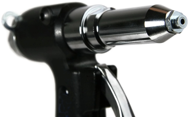 Lightweight powerful pneumatic air riveter installs blind rivets.