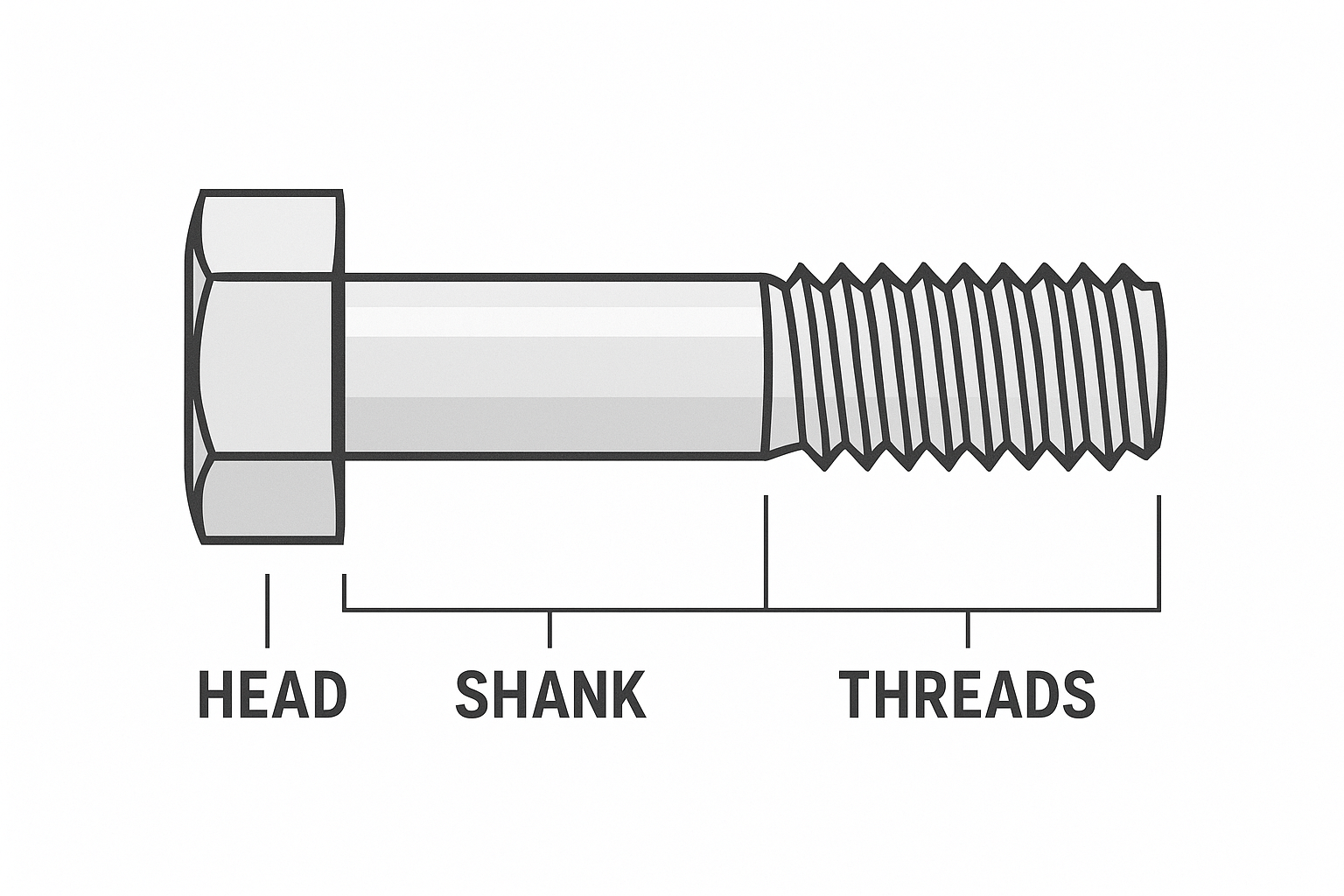 The standard bolt measurement includes the thread diameter, thread pitch, and length.