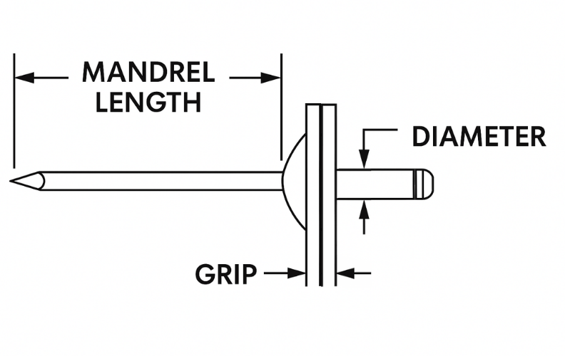 Rivets are measured by diameter and grip length. Rivet diameter is the diameter of the hole the rivet is inserted into. Grip range is the thickness of the material being fastened.