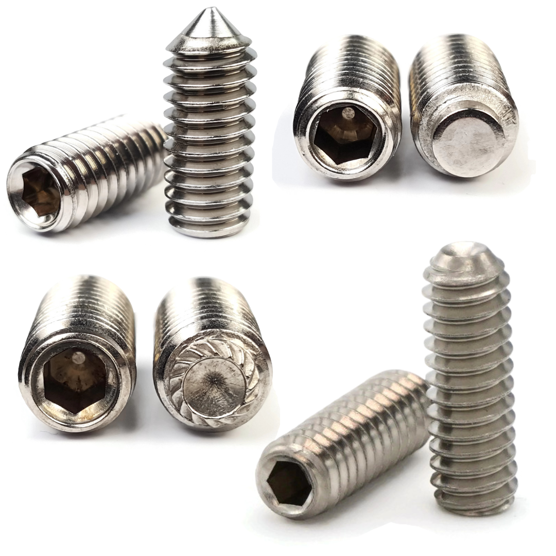 - Set Screws – Headless screws that lock collars, pulleys, and shafts (cup, cone, flat, dog points).