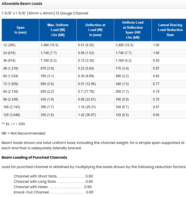 | Span In (mm) | Max. Uniform Load (W) Lbs (kN) | Deflection at Load (W) In (mm) | Uniform Load at Deflection Span /240 Lbs (kN) | Lateral Bracing Load Reduction Rate |