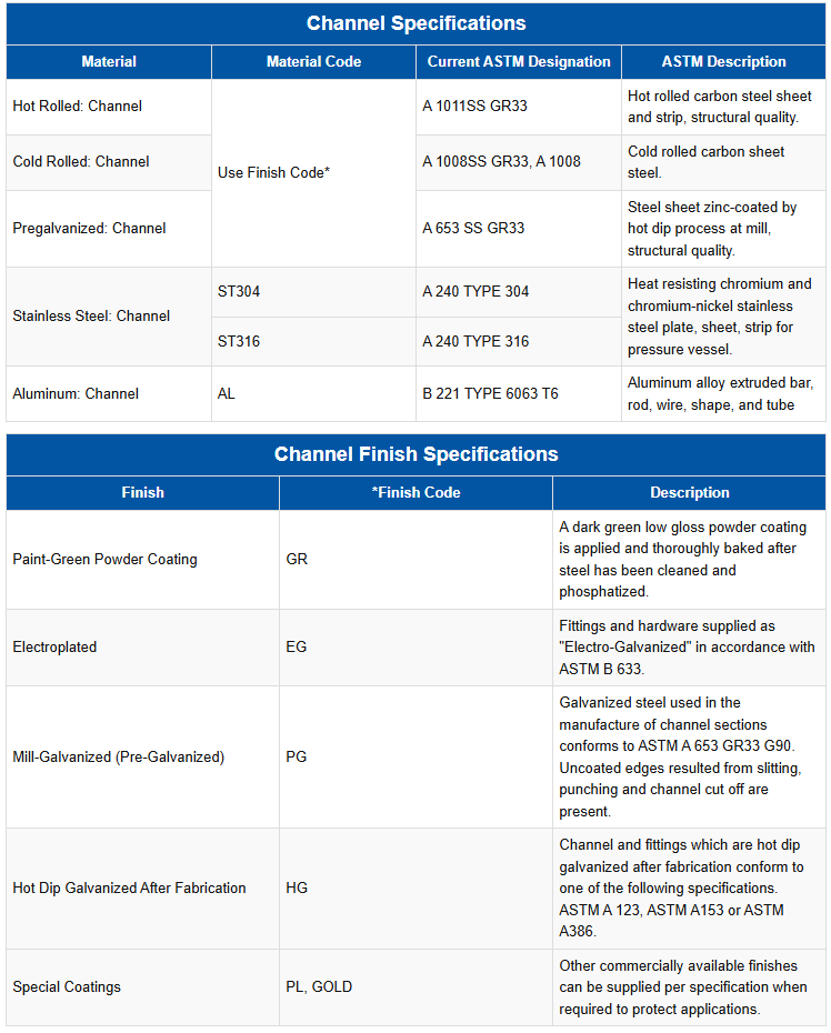- Steel used in the manufacture of channels conforms to the ASTM specifications under the Specifications tab below.