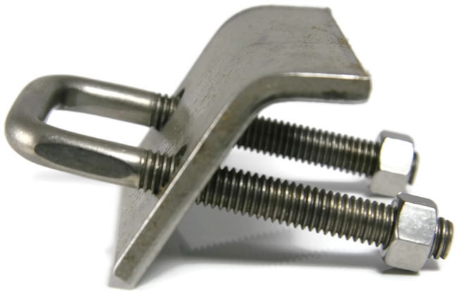 Stainless Steel Beam Clamps with hex nuts and a metal plate designed to hold channel beams in a strut assembly.