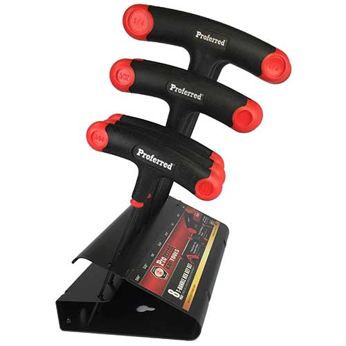 This 8 Piece T Handle Hex Key Set features ergonomically designed clearly labeled handles for easy identification and a comfortable grip while working with hex socket head fasteners.