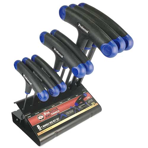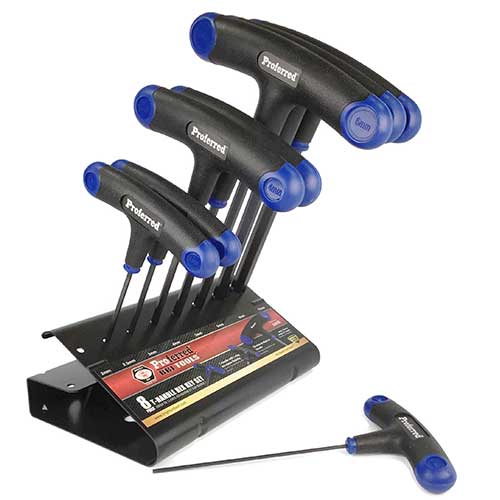 This 8 Piece T Handle metric Allen key set features ergonomically designed clearly labeled handles for easy identification and a comfortable grip while working with hex socket head fasteners.