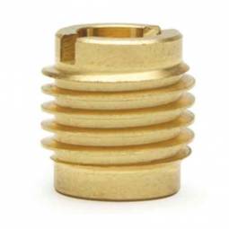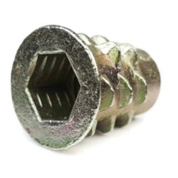 Typically brass with sharp knife threads that bite into hardwoods and softwoods. Provide durable machine threads for knock-down furniture, jigs, and fixtures. Drive styles include internal hex, external slot, and flange types.