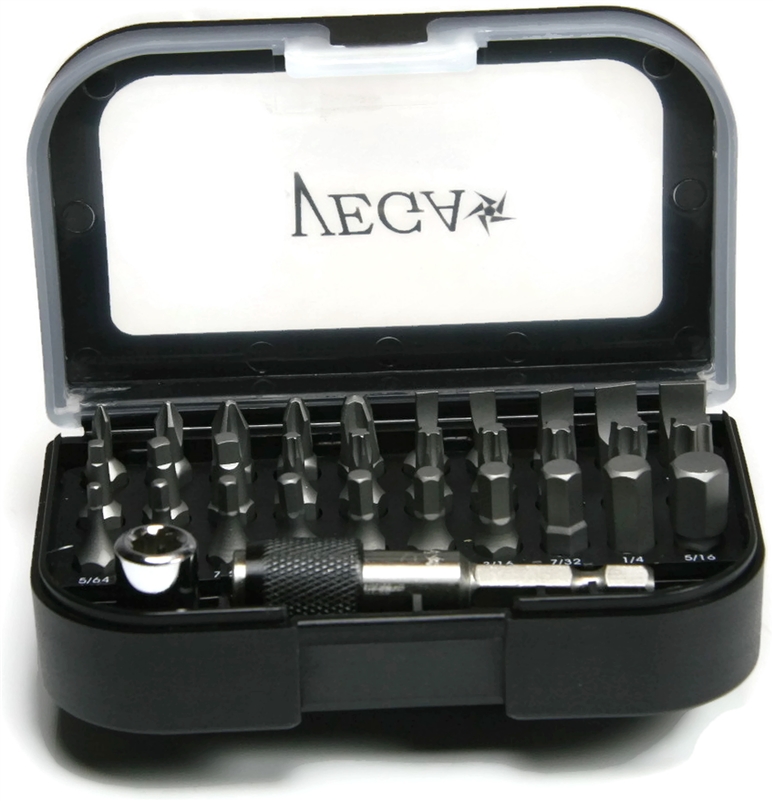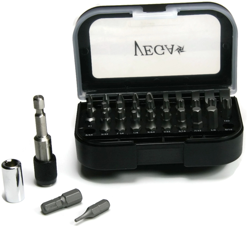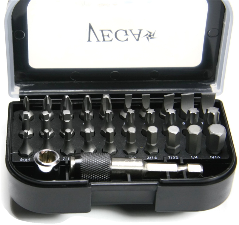 Quality 32 Piece Industrial Driver Bit Set with Standard Bits. 30 Standard Industrial Bit Tips with a quick release bit holder and a socket adapter for 1/4" bits. Made from S2 modified shock resistant steel for professional performance and durability. Proprietary precision CNC machined tips for excellent fit in fastener recess. Durable drop resistant case with a convenient belt clip makes it easy to carry around. Magnetic quick release bit holder included.