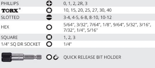 - HEX BITS: 5/64", 3/32", 7/64", 1/8", 9/64", 5/32", 3/16", 7/32", 1/4", 5/16"