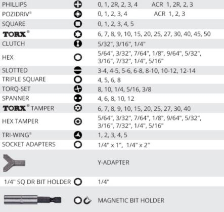 - PHILLIPS BITS: 0, 1, 2R, 2, 3, 4