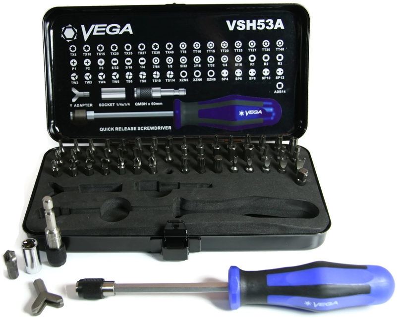 Quality 53 Piece Bit and Hand Driver Set with standard and security drive bits. Industrial screwdriver with quick release function and durable metal storage case. Made from S2 modified shock resistant steel for professional performance and durability. Proprietary precision CNC machined tips for excellent fit in fastener recess.
