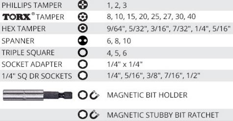 - TORX TAMPER PROOF BITS: T8, T10, T15, T20, T25, T27, T30, T40