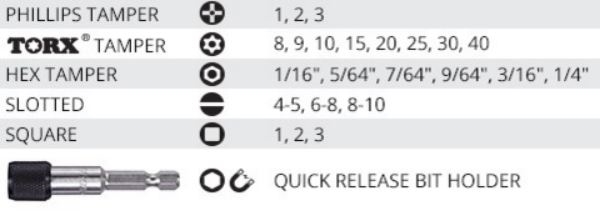- TORX TAMPER PROOF BITS: T8, T9, T10, T15, T20, T25, T30, T40