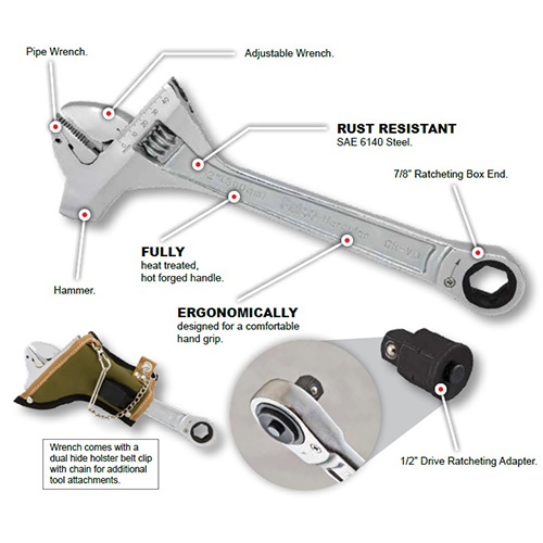 - Features Standard Adjustable Wrench, Pipe Wrench Attachment, Hammer, 7/8" Ratcheting Box End and 1/2" Drive Ratcheting Adapter