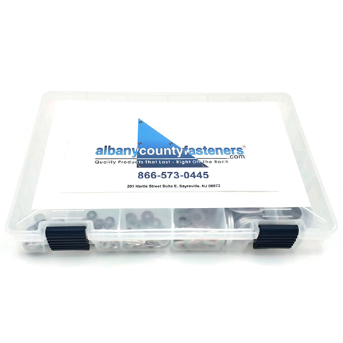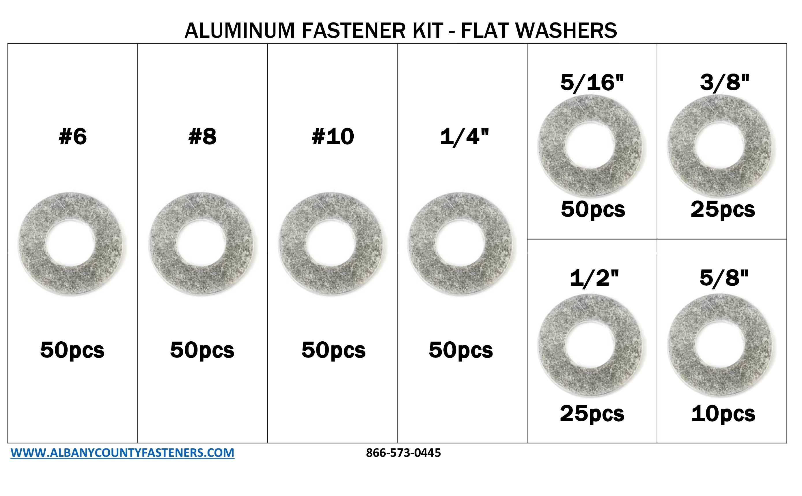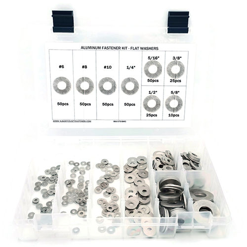 This kit features a size assortment of aluminum flat washers in sizes #6 through 5/8", all in a labeled compartment box for easy storage and identification.
