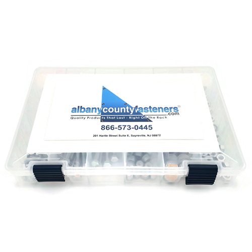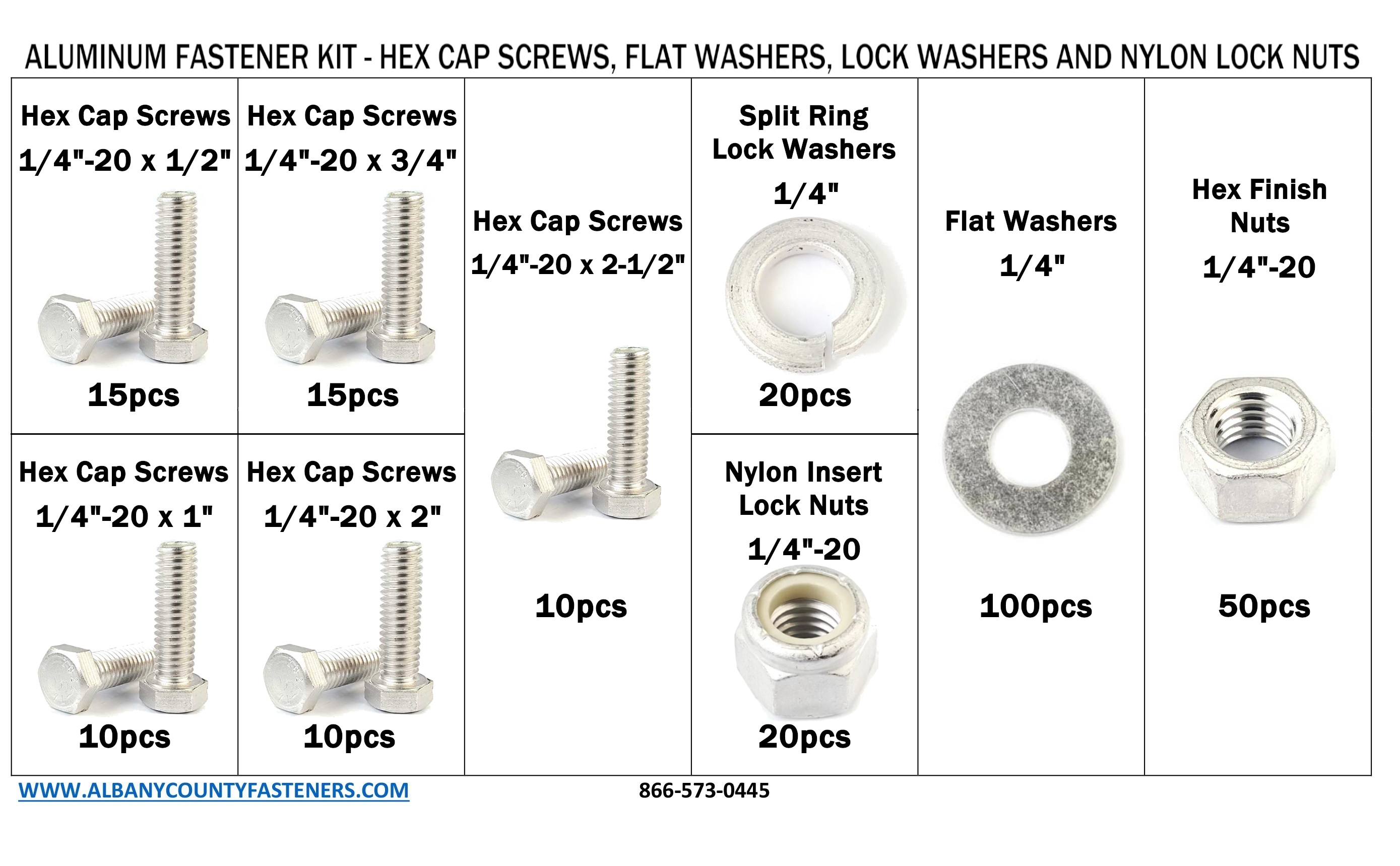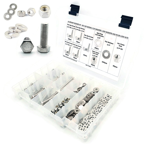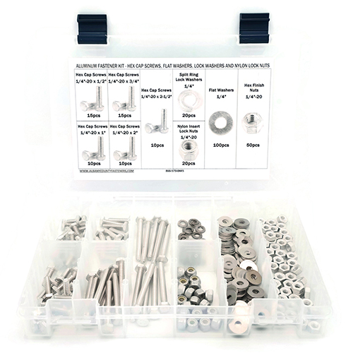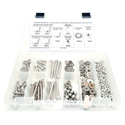 The 1/4"-20 Aluminum Hex Tap Bolts Kit features hex bolts in lengths up to 2-1/2" with matching washers, nuts lock washers and lock nuts all in a convenient labeled compartment box. Aluminum nuts and bolts are prized for their extremely high strength-to-weight ratio, making them a great solution where weight is a concern without sacrificing the quality of the fastener. They are commonly used in the automotive, aerospace, and general machinery industries. Aluminum fasteners are corrosion resistant, lightweight, and non-magnetic.