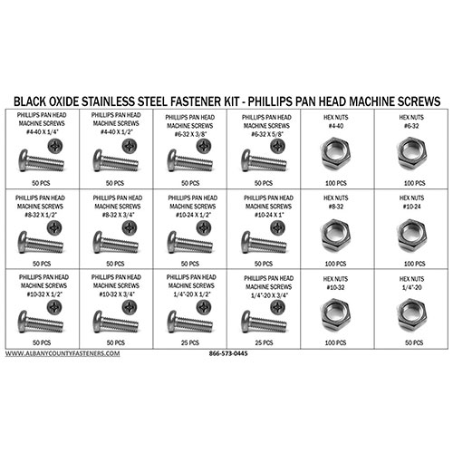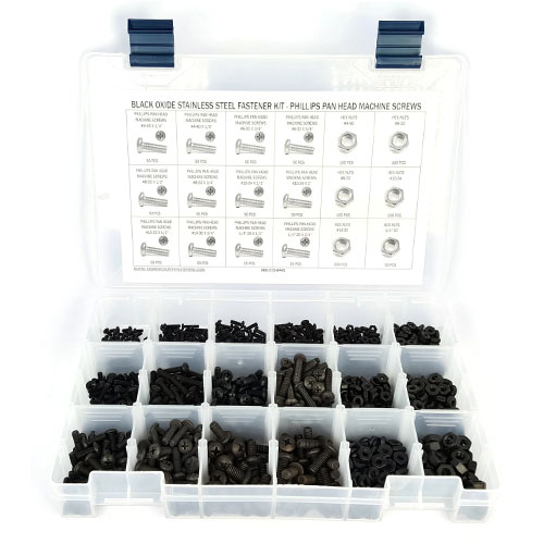 - Black Oxide 18-8 stainless steel Phillips pan head machine screw kit with matching hex nuts