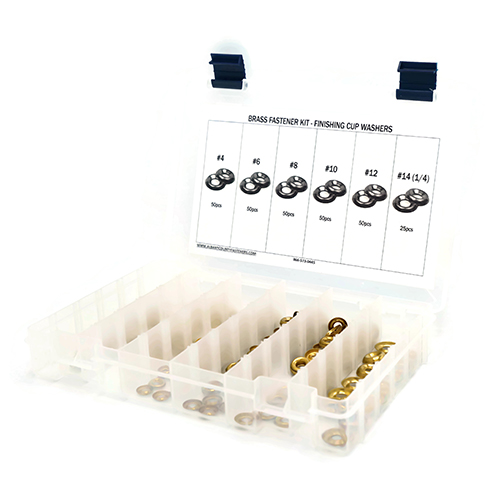 Brass Finishing Cup Washers add a beautiful finish to many installations. All stored in a durable and organized plastic compartment box.