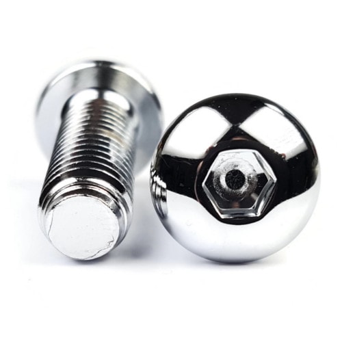 Button head socket cap screws in this selection are plated with highly corrosion resistant chrome to keep fasteners looking sleek and shiny in an installation.