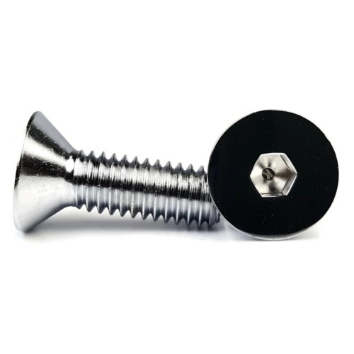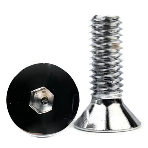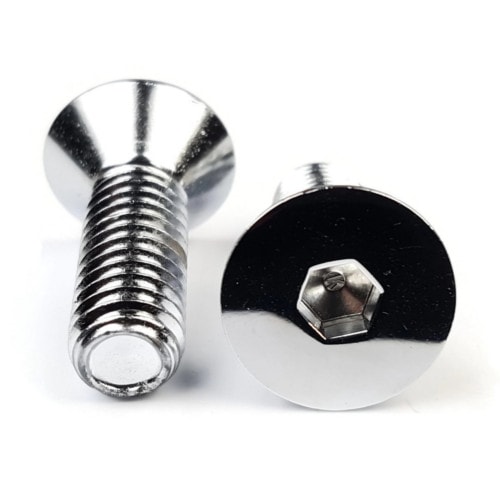 Flat head socket cap screws in this selection are steel plated with corrosion resistant chrome to keep fasteners looking sleek and shiny in an installation, perfect for finish and automotive applications.