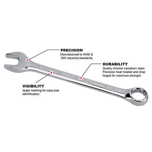 Chrome finish combination wrenches in this selection are precision manufactured to ANSI and DIN standards, drop forged and heat treated for maximum strength. The chrome vanadium steel adds durabiltity to each wrench, and features a large size display for quick and easy identification. Perfect for replacing a lost or damaged wrench in a set!