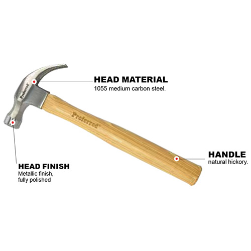 Professional quality 16 oz. curved hammer featuring a natural hickory handle and fully polished 1055 medium carbon steel head. This general purpose hammer features a curved claw for excellent leverage and ease of use when removing nails. The natural hickory handle is designed to keep the tool light, and to absorb the shock created when driving a nail.