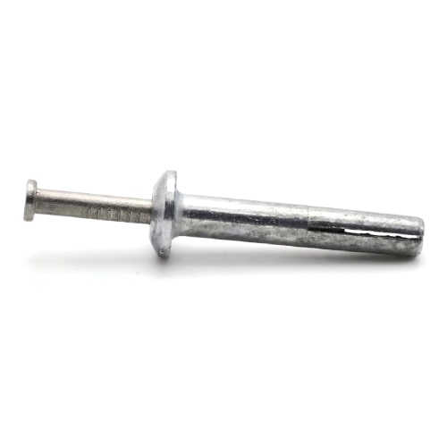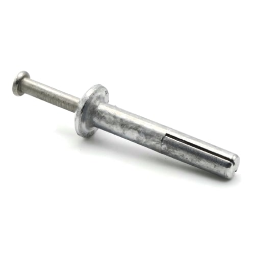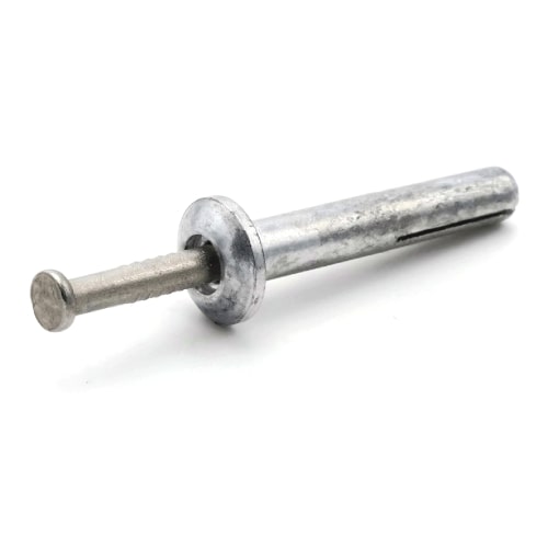 A 304 Stainless steel Hammer Drive Pin (or just drive pin) attaches fixtures to solid concrete or certain types of concrete blocks. They are also sometimes referred to as mushroom head anchors, nail in anchors, or drive nail anchors.