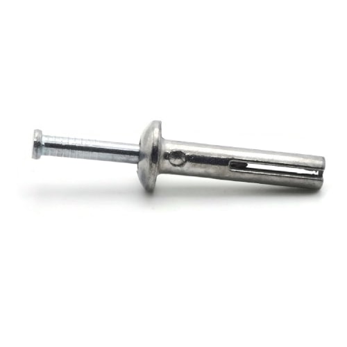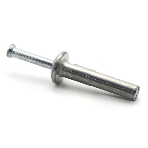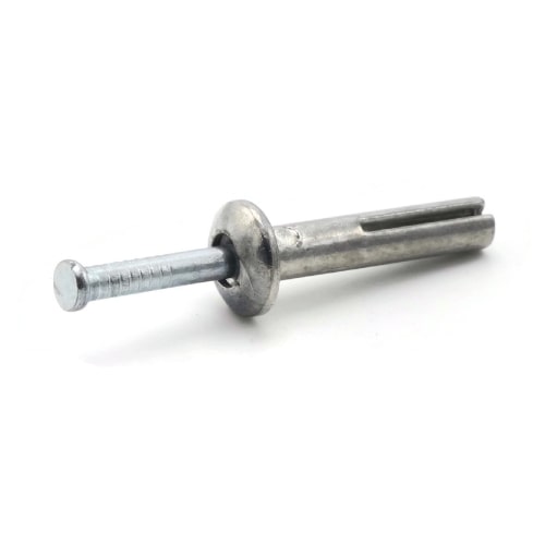 A zinc plated steel Hammer Drive Pin (or just drive pin) attaches fixtures to solid concrete or certain types of concrete blocks. They are also sometimes referred to as mushroom head anchors, nail in anchors, or drive nail anchors.