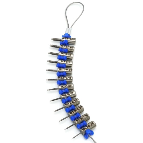 Thread gauges are used to identify size and thread pitch of nuts, bolts and screws. This gauge is specifically designed with small fasteners in mind, and contains metric sizes M1.2-0.25 to M3.5-0.35.