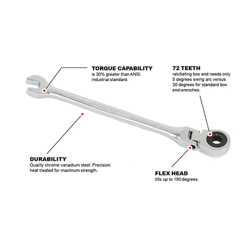 Flex Head Ratcheting Combo Wrenches have a flexible ratcheting box end. This makes getting those bolts in hard to reach places off easy. Adding in the ratcheting capability and you have an all in one wrench that can get most jobs done. These wrenches are designed to be more precise than standard ratcheting wrenches. With 72 teeth built into the box end, the wrench only needs to be turned 5 degrees to lock into place compared to the standard 30 degrees.
