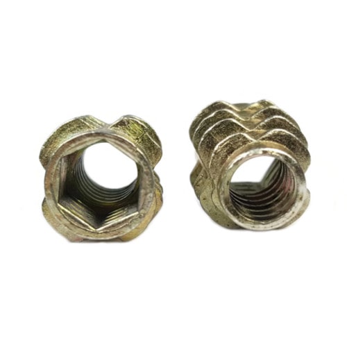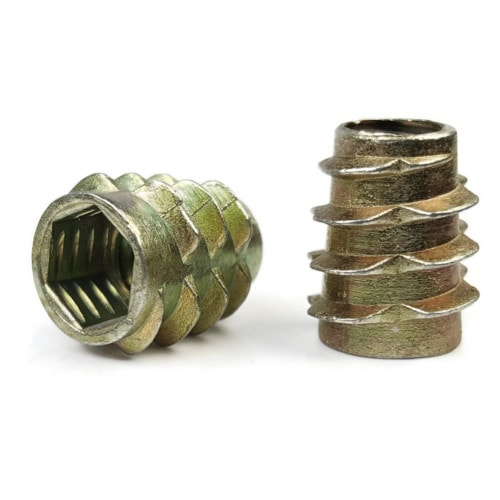 Flush Hex Drive Threaded Inserts are installed the same way as any other threaded insert. They do not have a lip near the head, so they can be installed completely flush with the surface or even a little countersunk. Flush drive threaded inserts are generically referred to as Type E insert nuts.