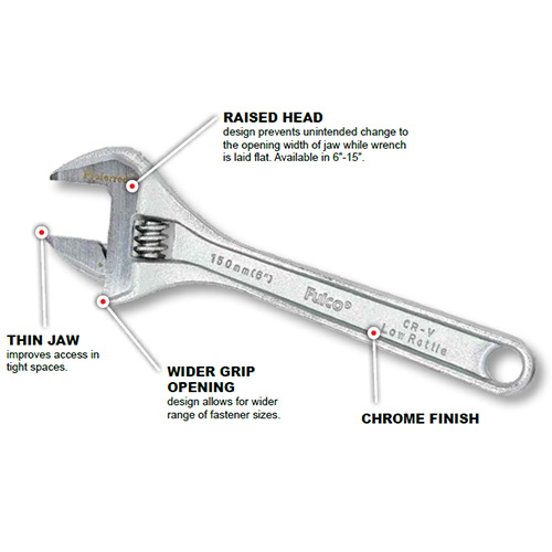 Professional grade heavy duty adjustable wrenches with a protective chrome finish. Adjustable wrenches in this selection feature a thicker handle for less strain on your hands, as well as an extra wide jaw opening for greater fastener compatibility. To help with working in those tight spaces, the design features a 115 degree offset as well as a thinner jaw.
