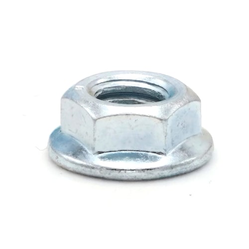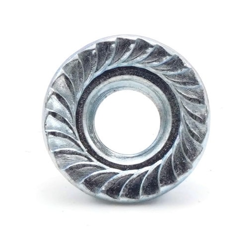 Serrated Flange Nuts (also known as Flanged Lock Nuts or simple Flange Nuts) feature a an integrated serrated washer at the bottom of the nut that resists vibration and is used to prevent accidental loosening of the nut after installation. Metric Flange Nuts are CR+3 case hardened zinc plated Class 8 steel, and are manufactured to DIN 6923 / ISO 4161 sizing specifications.
