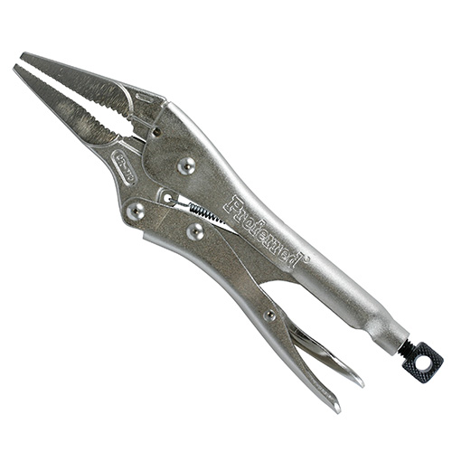 Needle Nose Locking pliers, often called mole grips, vise grips, vice grips or needle nose vise-grips, are pliers that can lock into position. There is an adjustable knob on the bottom of these pliers to adjust the locking position so that it can fit to many different applications. Adjustable pliers have a lever action that means significantly more force can be applied than standard pliers. Once the pliers are locked in place there is a small lever that can be compressed to release the locking hold. The needle like jaws allow the user to grab onto finer objects for more tuned control.